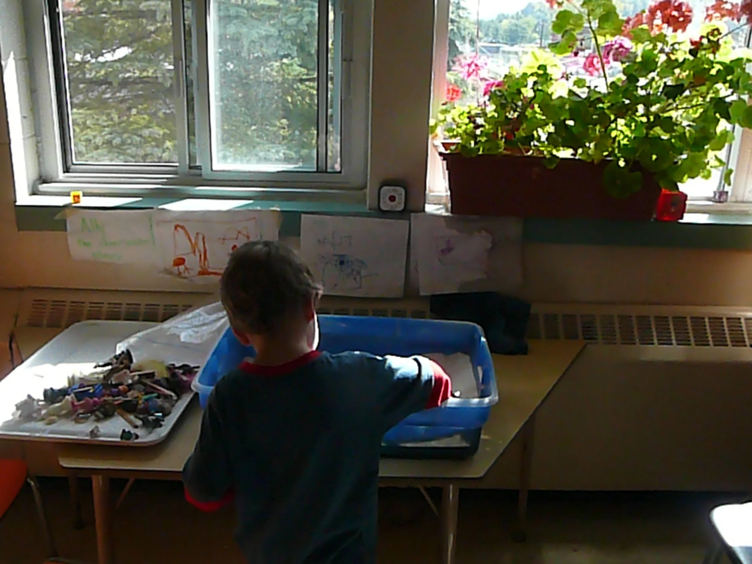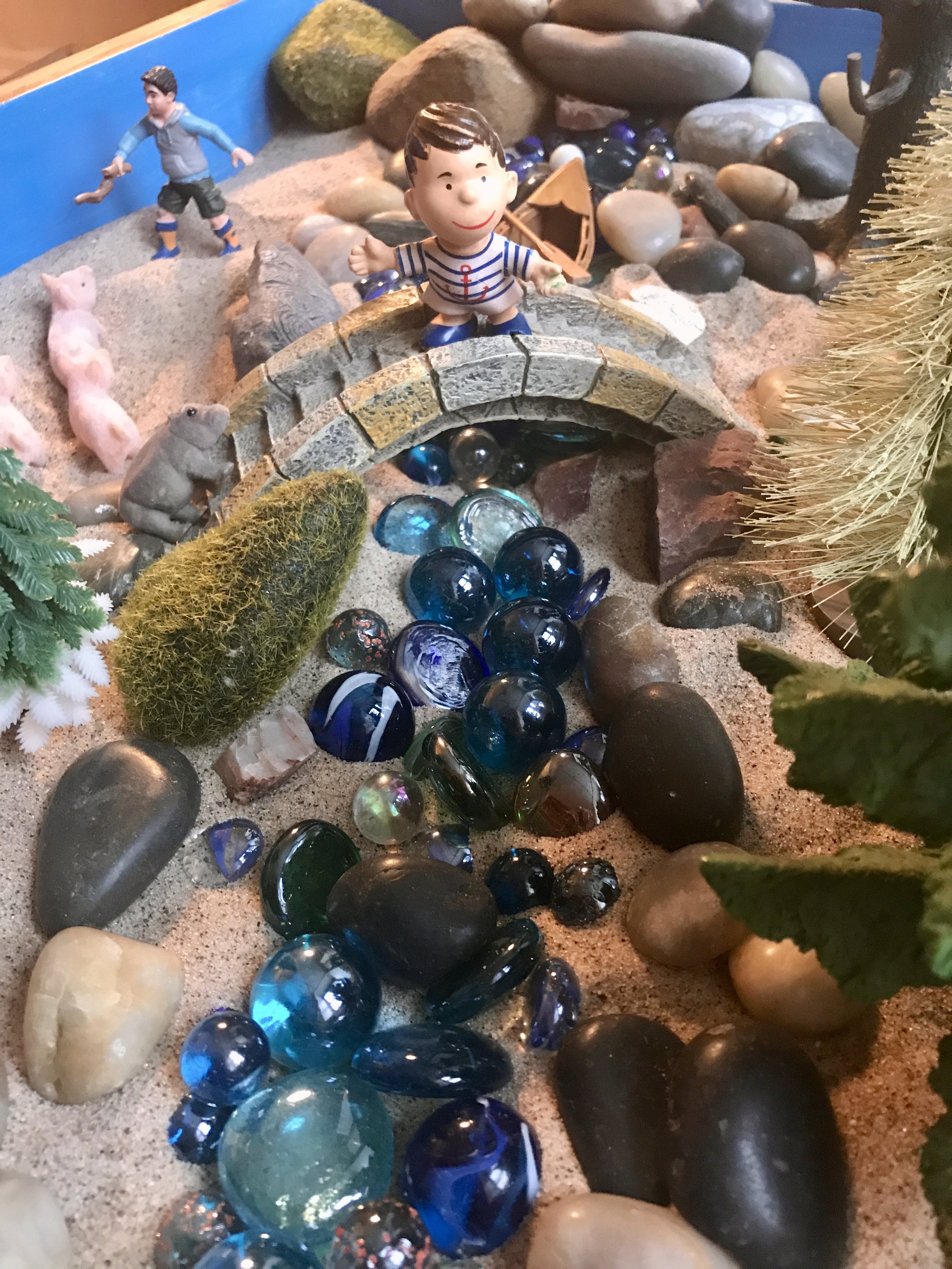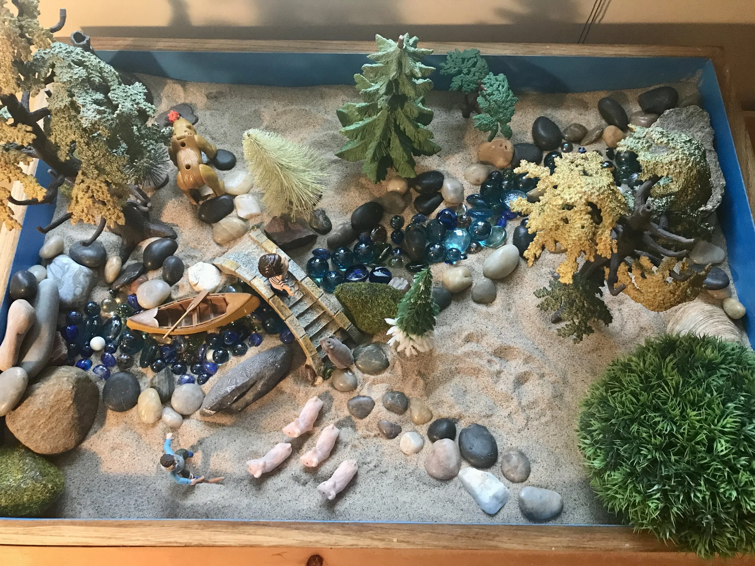 I was their Special Education Resource teacher. I decided to offer play. I brought sandtrays and miniatures to my classroom and in the daily 90-minute Language block, 12 of those students built worlds in individual sandtrays and shared the stories they created there. The children’s own stories “breathed out” in their individual play became the working material by which they were motivated to “breathe in” the core proficiencies of the Oral and Written Language curriculum.